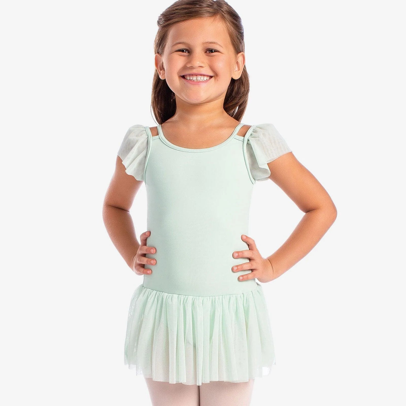 This leotard dress will be in the baby photos you show at her wedding. Adorable mesh flutter sleeves match the mesh skirt perfectly. Fully front-lined and made out of our comfortable microfiber, you know she needs this for her dance classes!