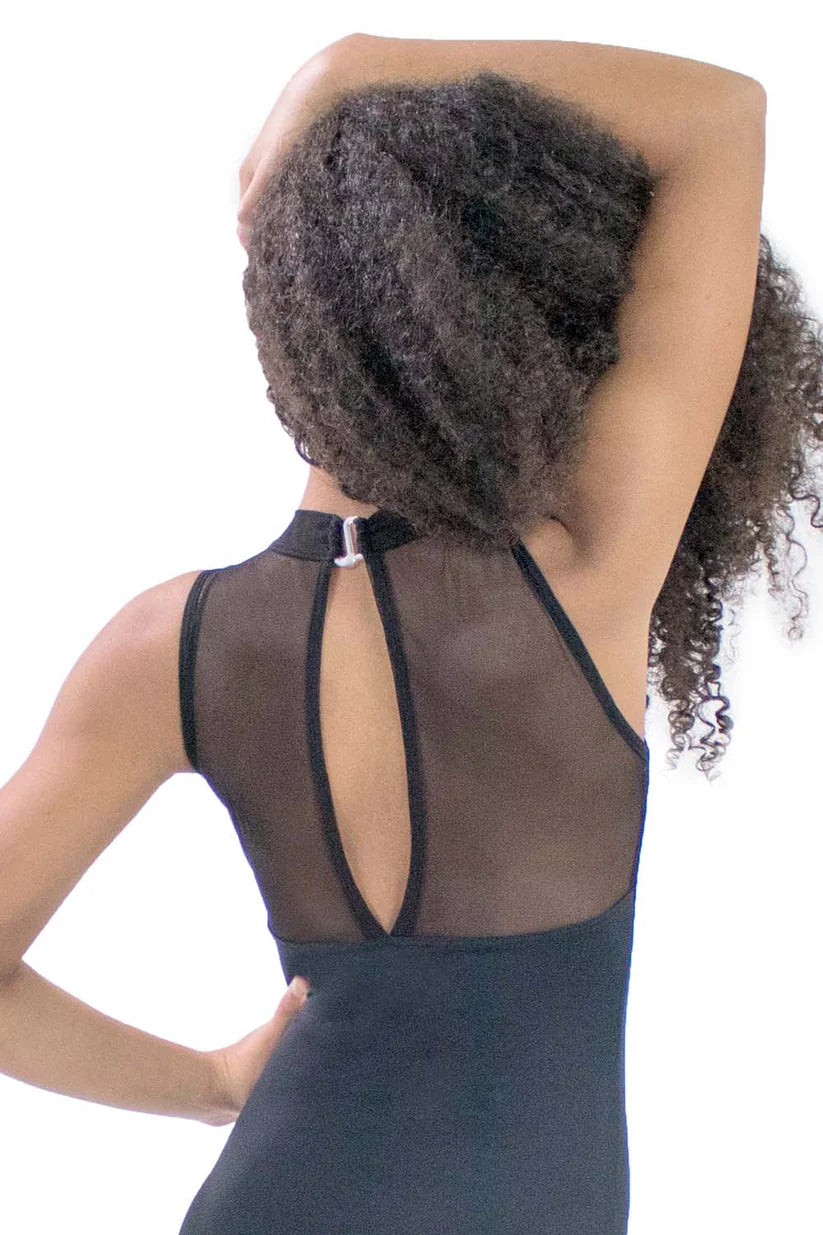 Microfiber mock neck leotard with a back hook. The leotard also features a mesh keyhole and mesh front yoke. Clear plastic hook for a no-fuss clean look closure.