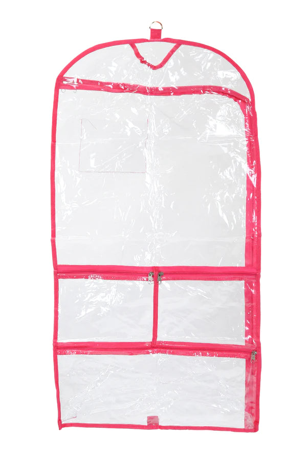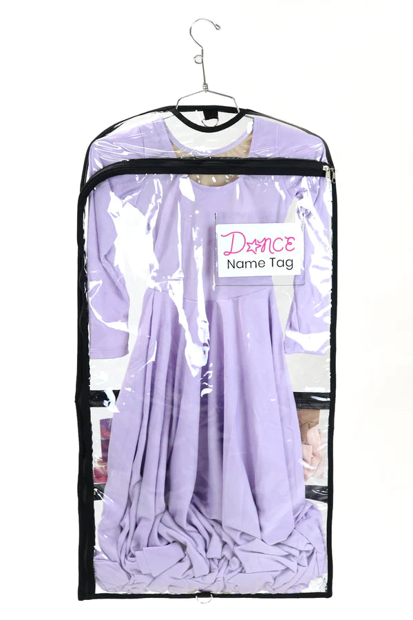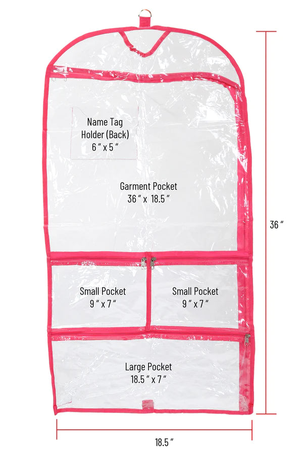 Clear PVC garment bag with 4 pockets for dance costumes and dresses. This bag protects, holds, and makes transporting your costume easy and organized. One large compartment (the length & width of the bag) to store your garment(s) and three smaller pockets for accessories or shoes (on one side of the bag). Buy one for each routine so you can keep your costume wrinkle free and your accessories all in one place for competition and recital.