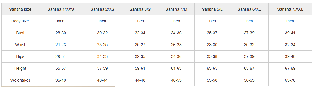 Sansha Sizes: XXS - 1 XS - 2 S- 3 M- 4 L- 5