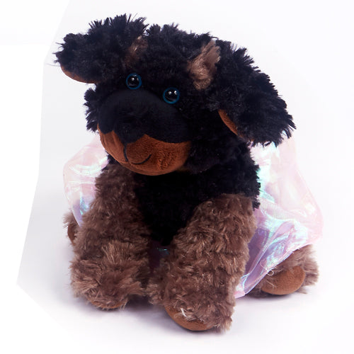 A scruffy puppy wearing an organza tutu. Super soft and stuffed with hypoallergenic fiber fill.Measures approximately 9 inches tall.